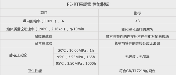PE-RT管材、管件是以乙烯-辛烯共聚物为主要原料,按照CJ/T175-2002生产的耐高温管道系统。它所用原料具有独特的分子结构,它以线性乙烯为主链,加上可控分支,从而具有良好的耐水压性能。它的柔软性特别好,在施工时容易弯曲而且不会变形,耐低温冲击性突出,安全卫生,热熔连接,接口可靠,永不渗漏,是地板采取的理想管材。要求。